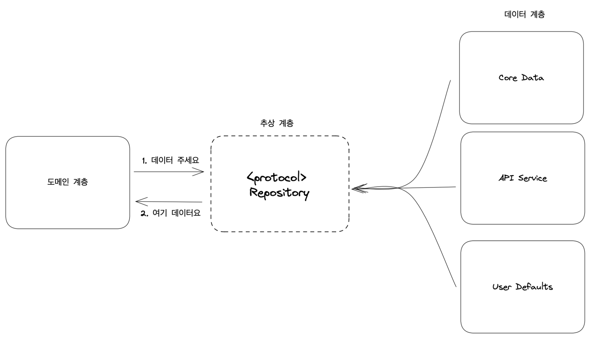 protocol Repository)를 만들면 실제 접근하는 데이터가 위에 나열한 4가지 데이터 중에 어떤 데이터에 접근했는지 관여하지 않고 도메인 계층은 모델을 사용할 수 있다.